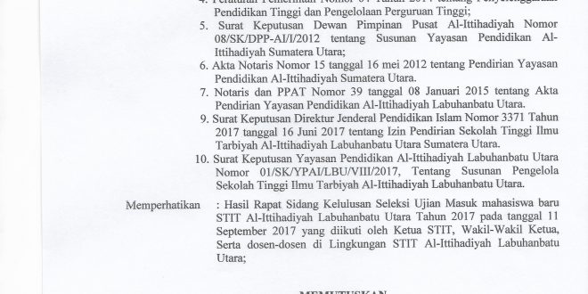 Dengan ini diumumkan hasil seleksi ujian masuk STIT Al-Ittihadiyah Labura. Surat keputusan lengkap dapat di download pada link berikut: